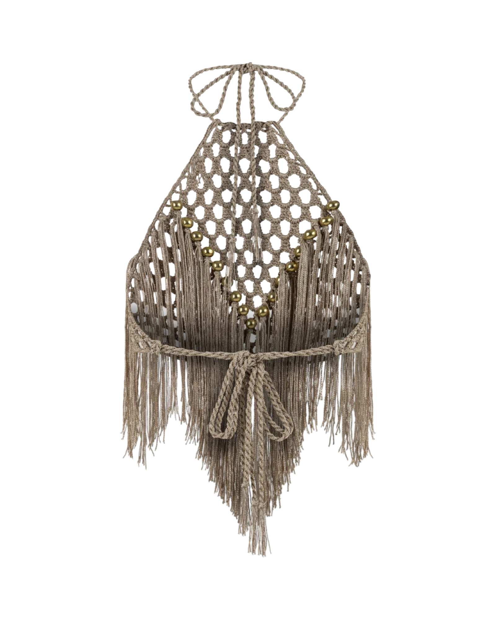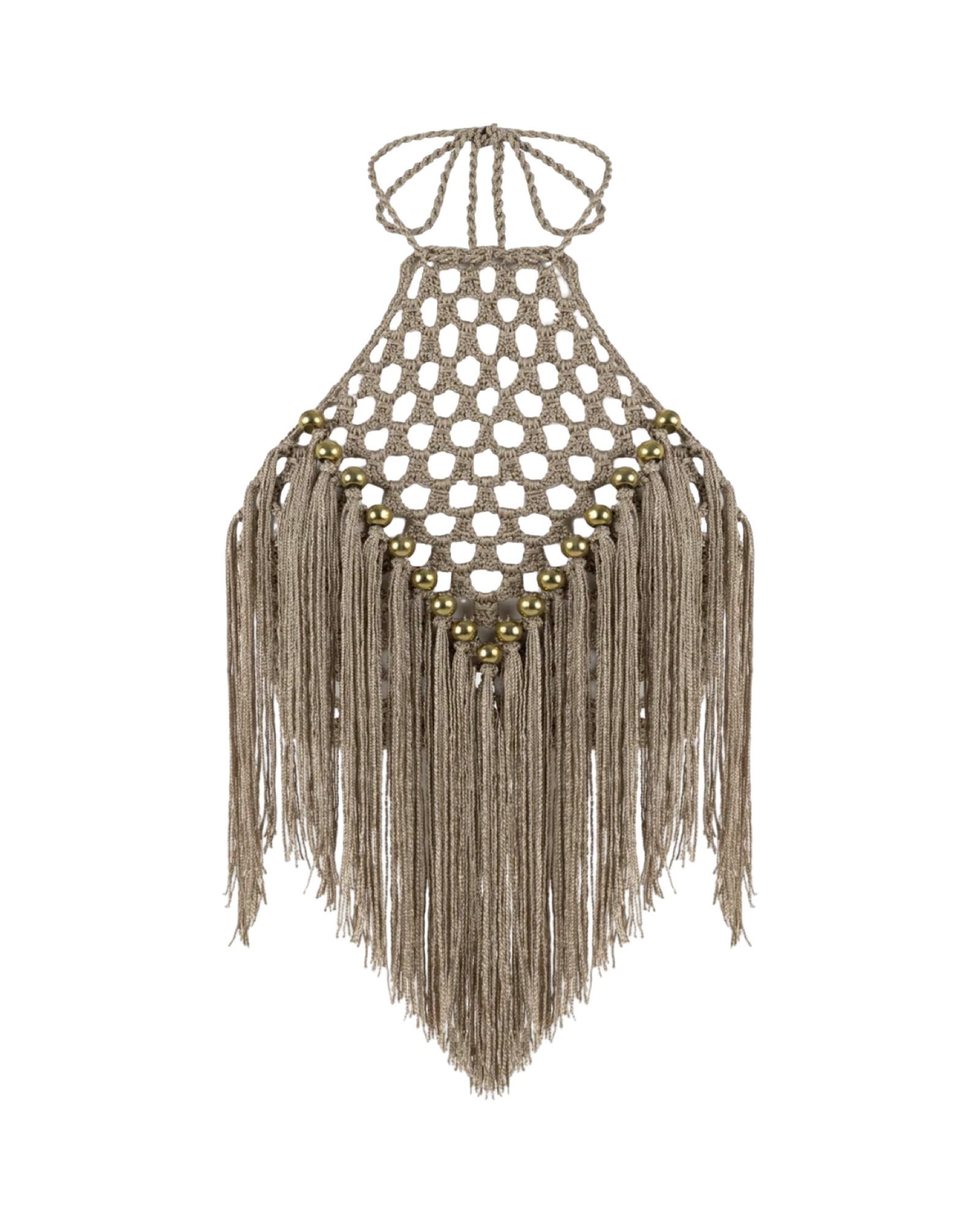 This women's hand-crocheted halter top features elegant bronze yarns and striking bead accents. It showcases a V-shaped asymmetric fringe design and includes an adjustable tie at the back of the neck for a perfect fit.