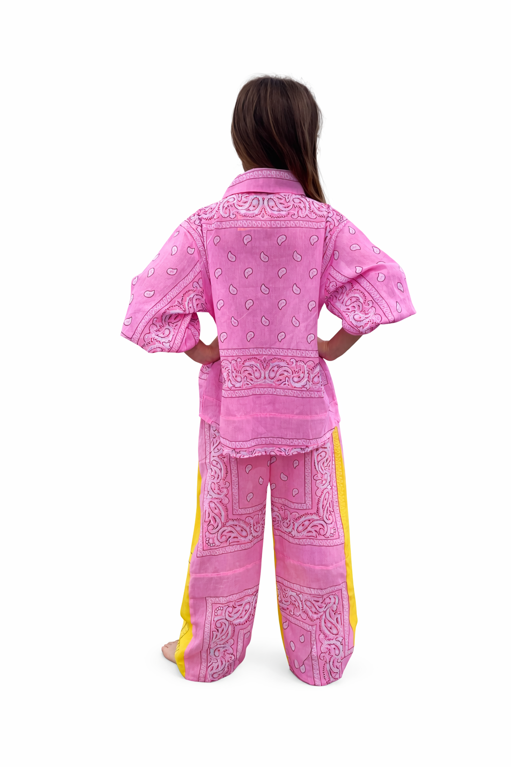 Adorable 100% cotton button down top in pink bandana print. The perfect piece for your little one's wardrobe. Layer it over swimwear for beach days, or style it solo with our wide-leg combo pants or puffed shorts for a complete outfit. From poolside cover-up to everyday adventure wear, this versatile kids' top transitions seamlessly from water play to whatever comes next.