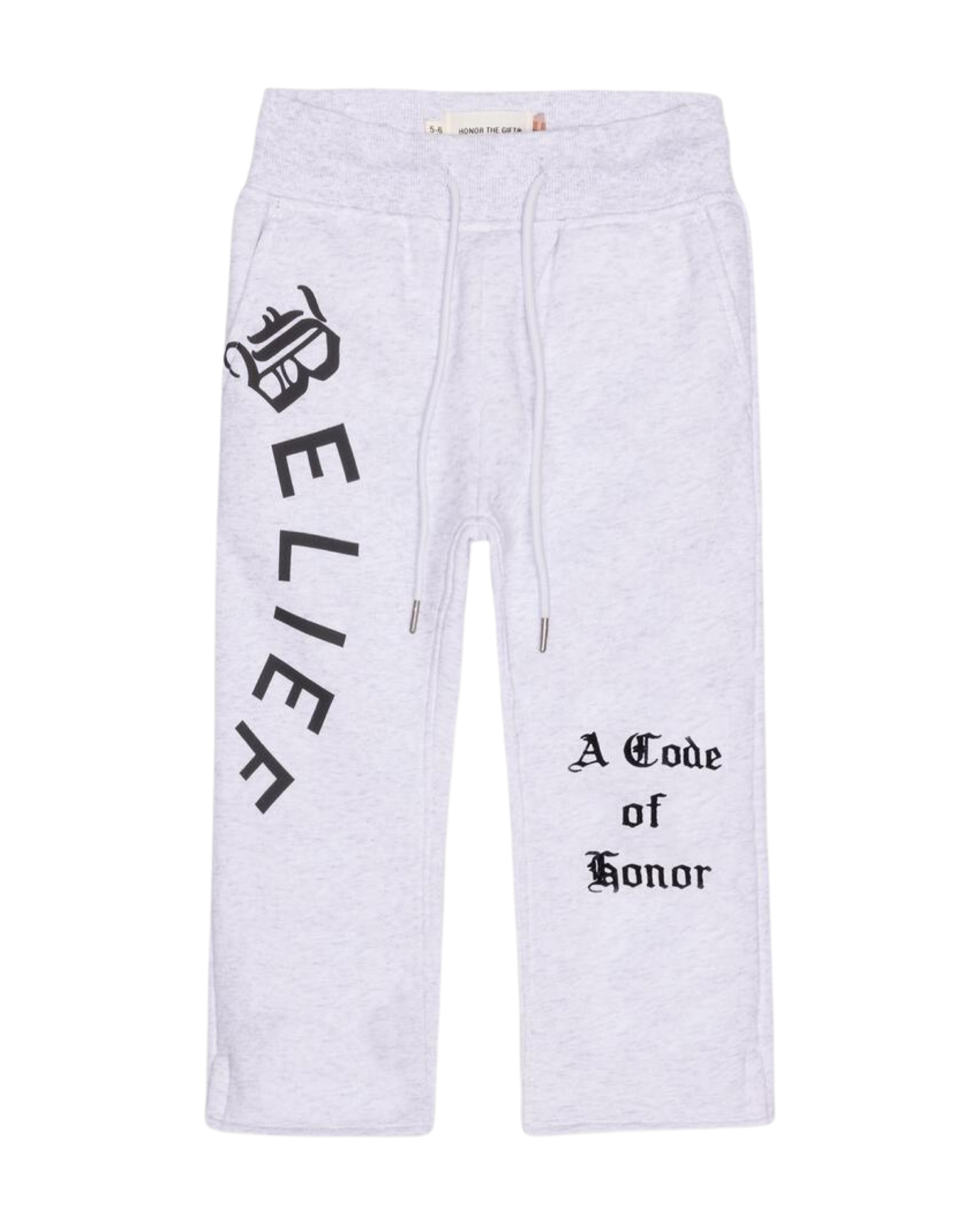 Indulge in the ultimate comfort and style with these light heather grey BELIEF sweatpants. Featuring a bold "belief" graphic and logo on the back, these high-quality pants are perfect for active boys who value both fashion and functionality.