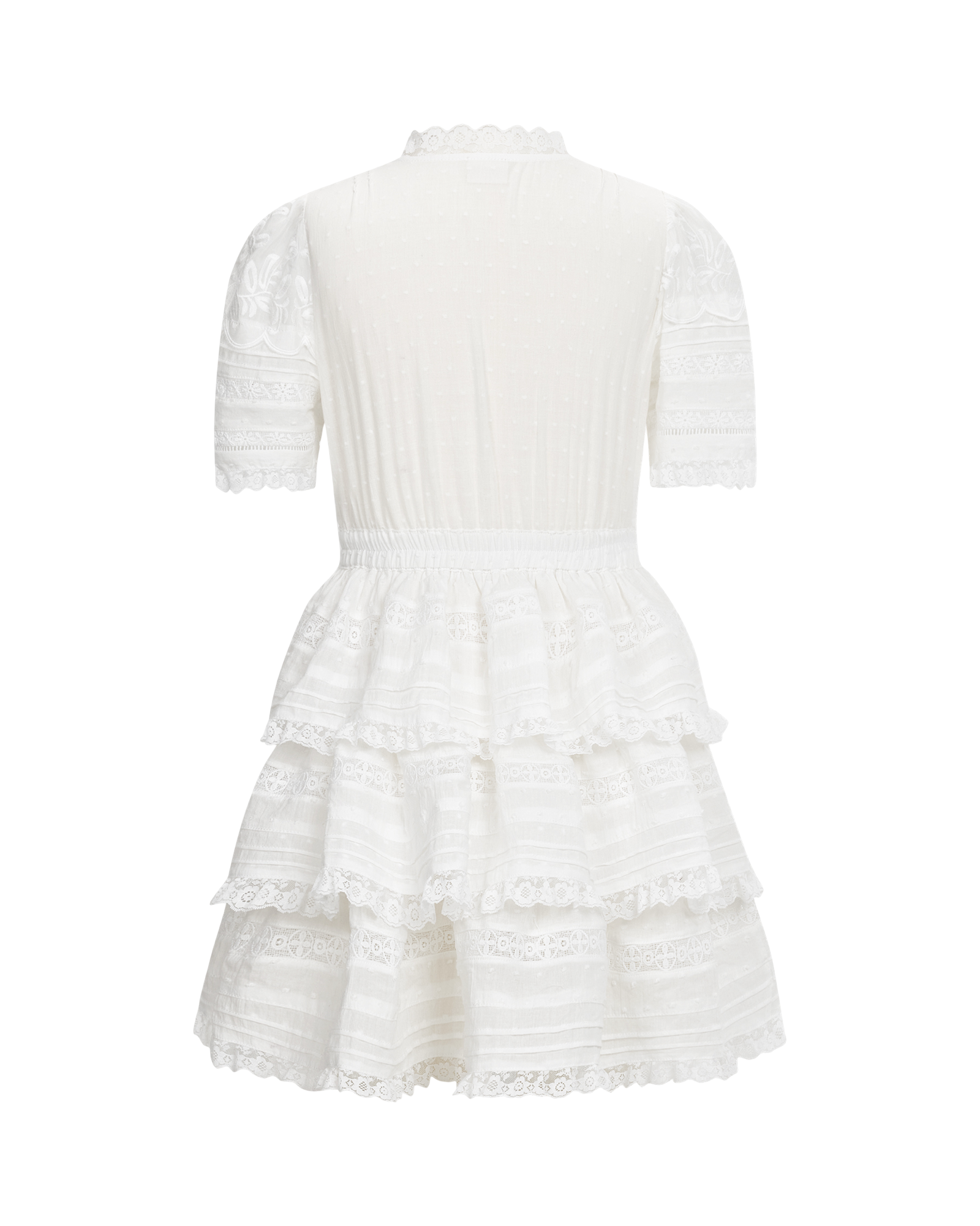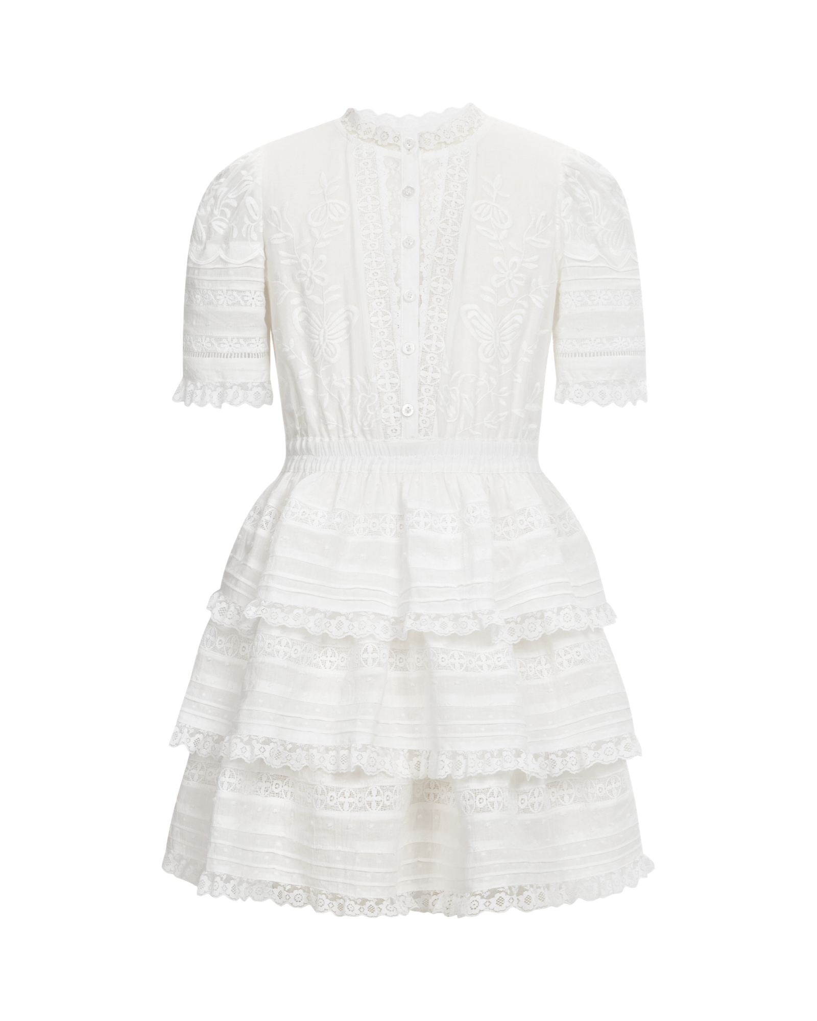 This girl's mini dress features detailed floral embroidery, a mini silhouette, puff sleeves, and delicate ruffle accents. It includes an invisible back zipper and is fully lined for comfort. Crafted from a luxurious blend of 30% silk and 70% cotton.