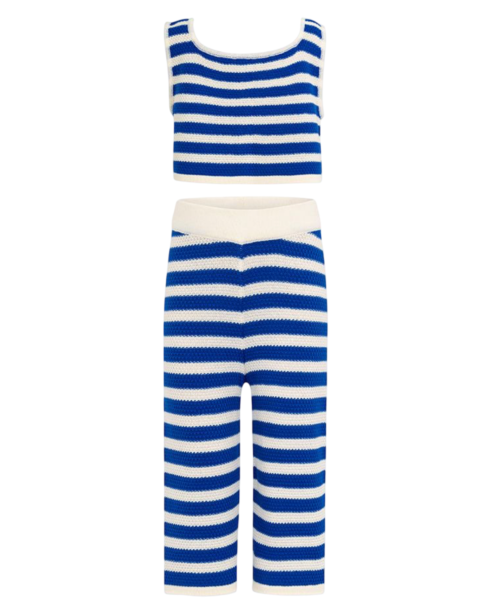 Featuring a cozy knit crop top in classic blue and white stripes paired with matching pants, it's the perfect combo for laid-back style.