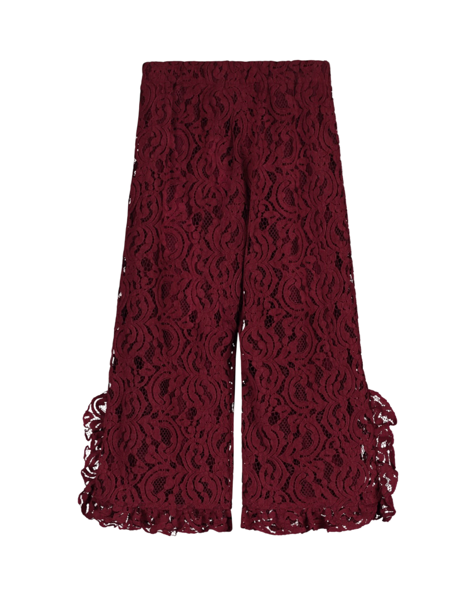 These burgundy Chenille Lace Pants for girls come with playful ruffles at the leg hems and a soft elastic waistband for a comfy fit. Made from a blend of 60% polyamide, 30% polyester, and 10% elastane, they offer both style and stretch.