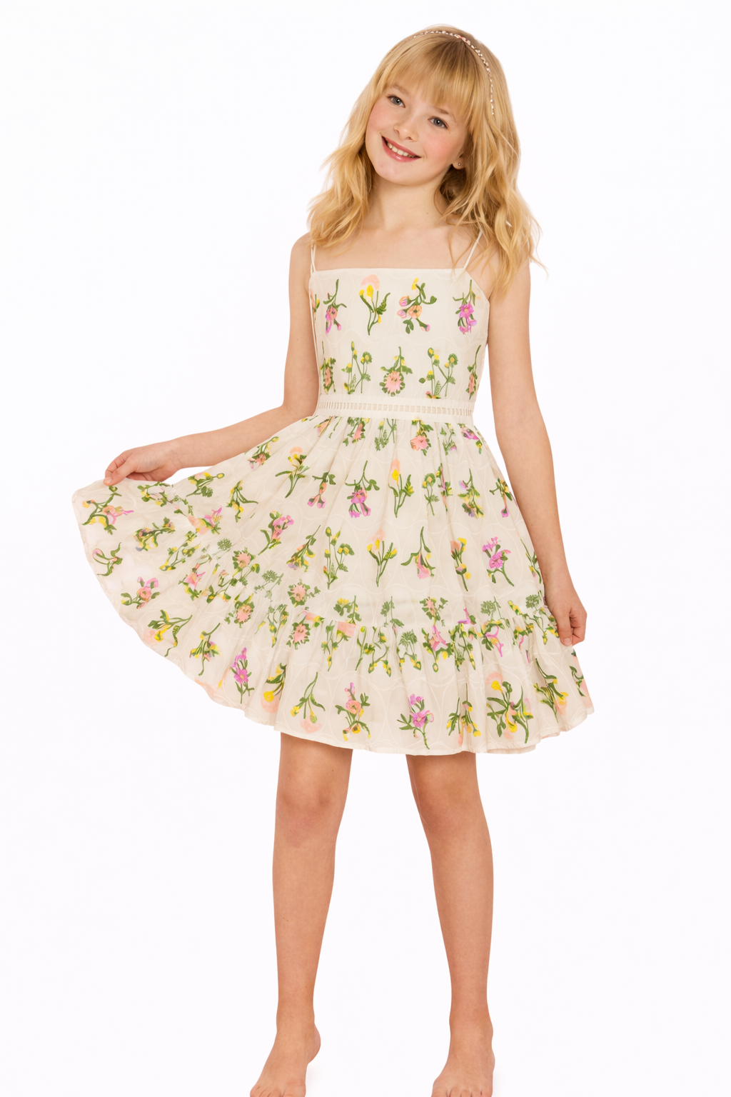 The Girls Emely Mini Dress features delicate embroidered floral details throughout for a soft, elevated look. Designed with sweet tie straps and a back zipper for easy wear, this girls mini dress is perfect for special occasions, family photos, and warm-weather celebrations. A timeless silhouette that feels both charming and effortless.