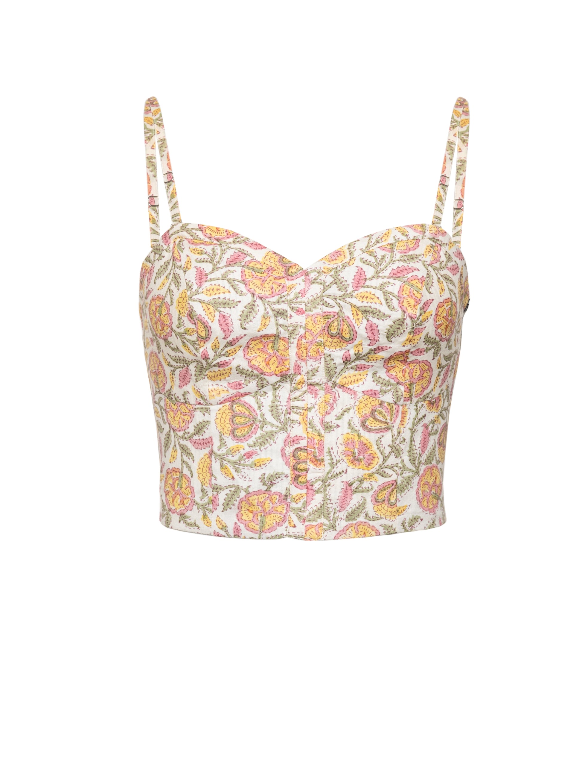 Made from hand-printed cotton voile with light boning, it's cut to a form-fitting silhouette. Can be worn with or without straps.