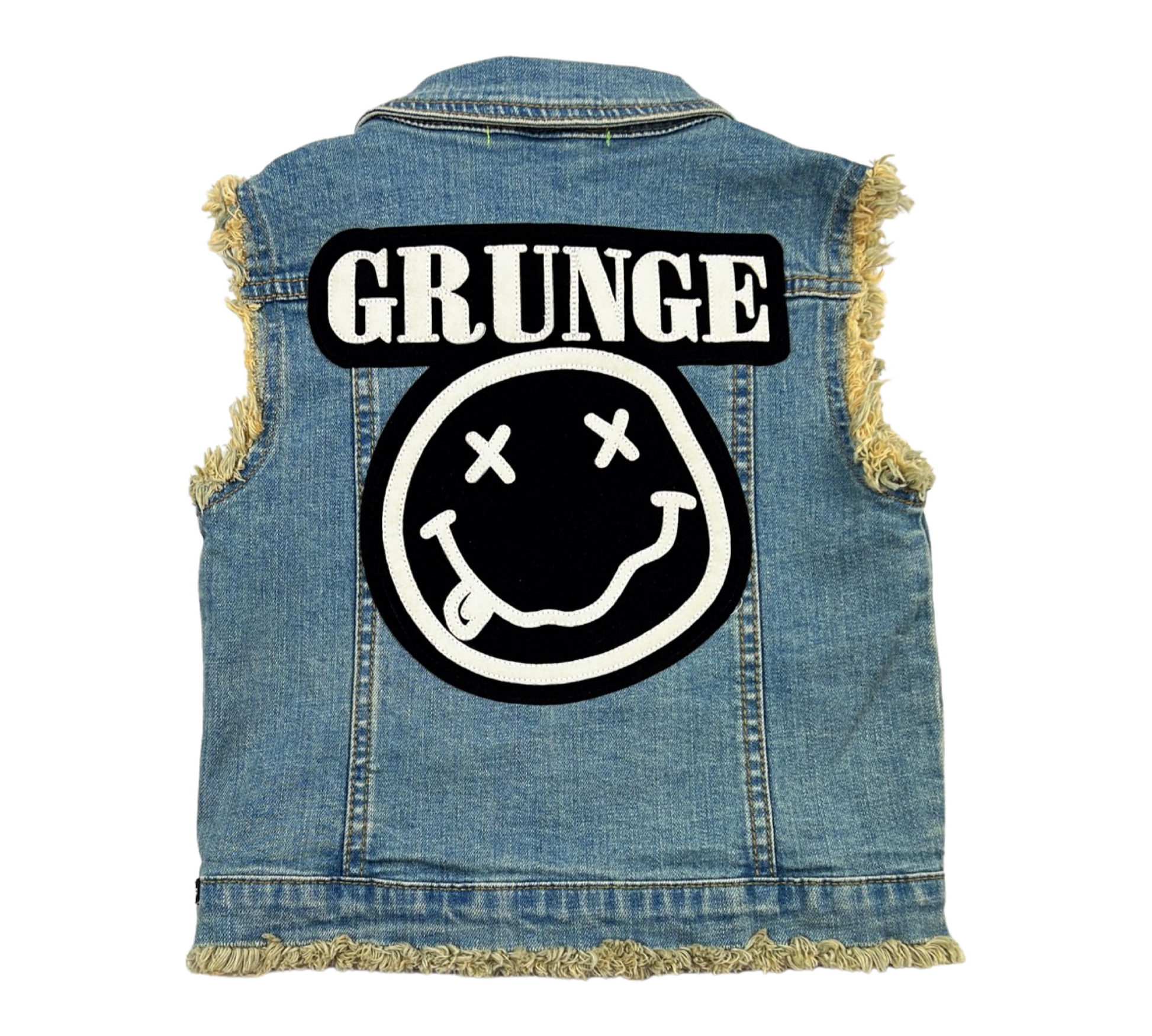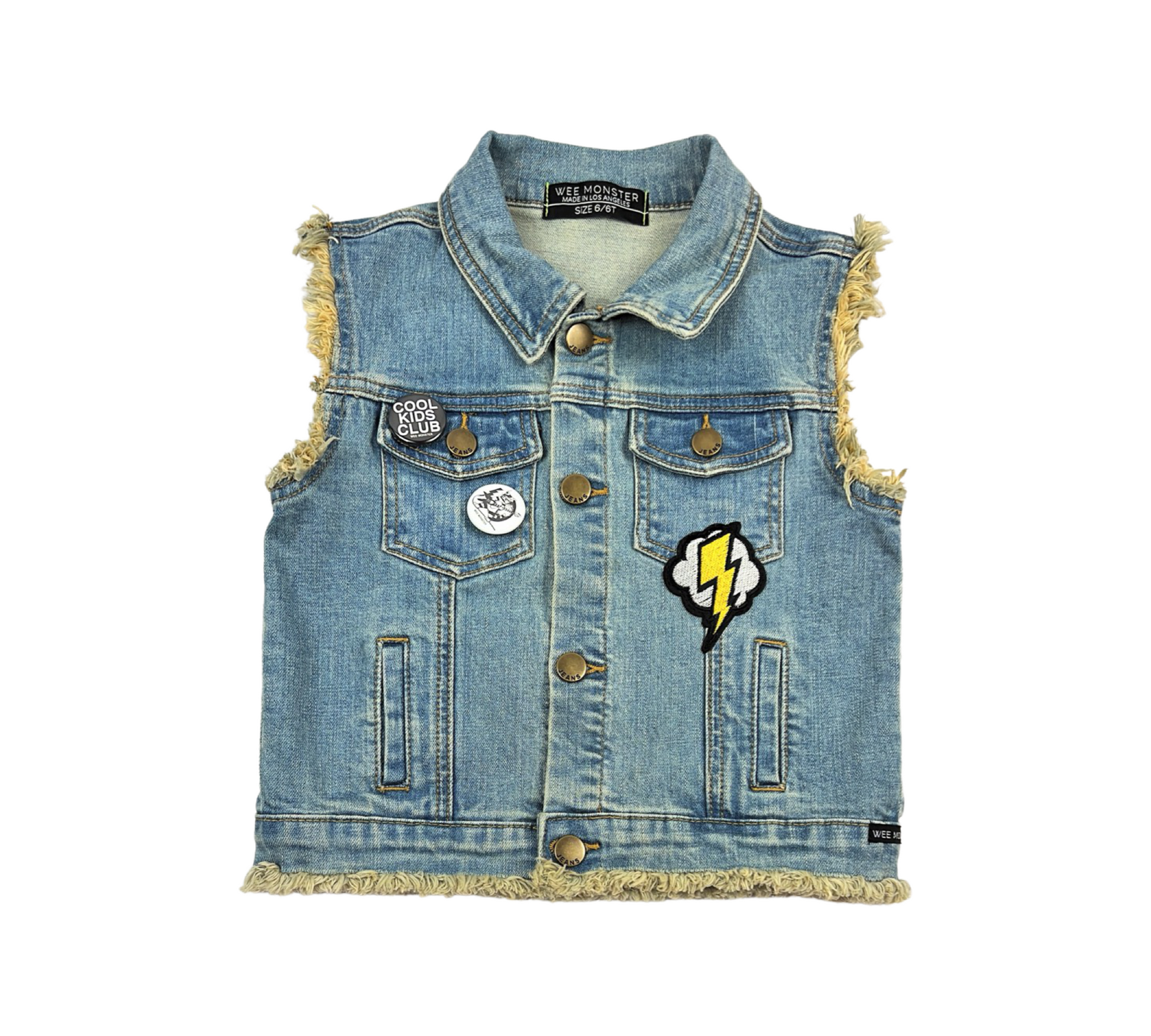 Experience the ultimate coolness with this medium denim wash vest featuring raw edge sleeves and button closure. Adorned with trendy patches and buttons, it's the must-have for all Grunge kids fans!