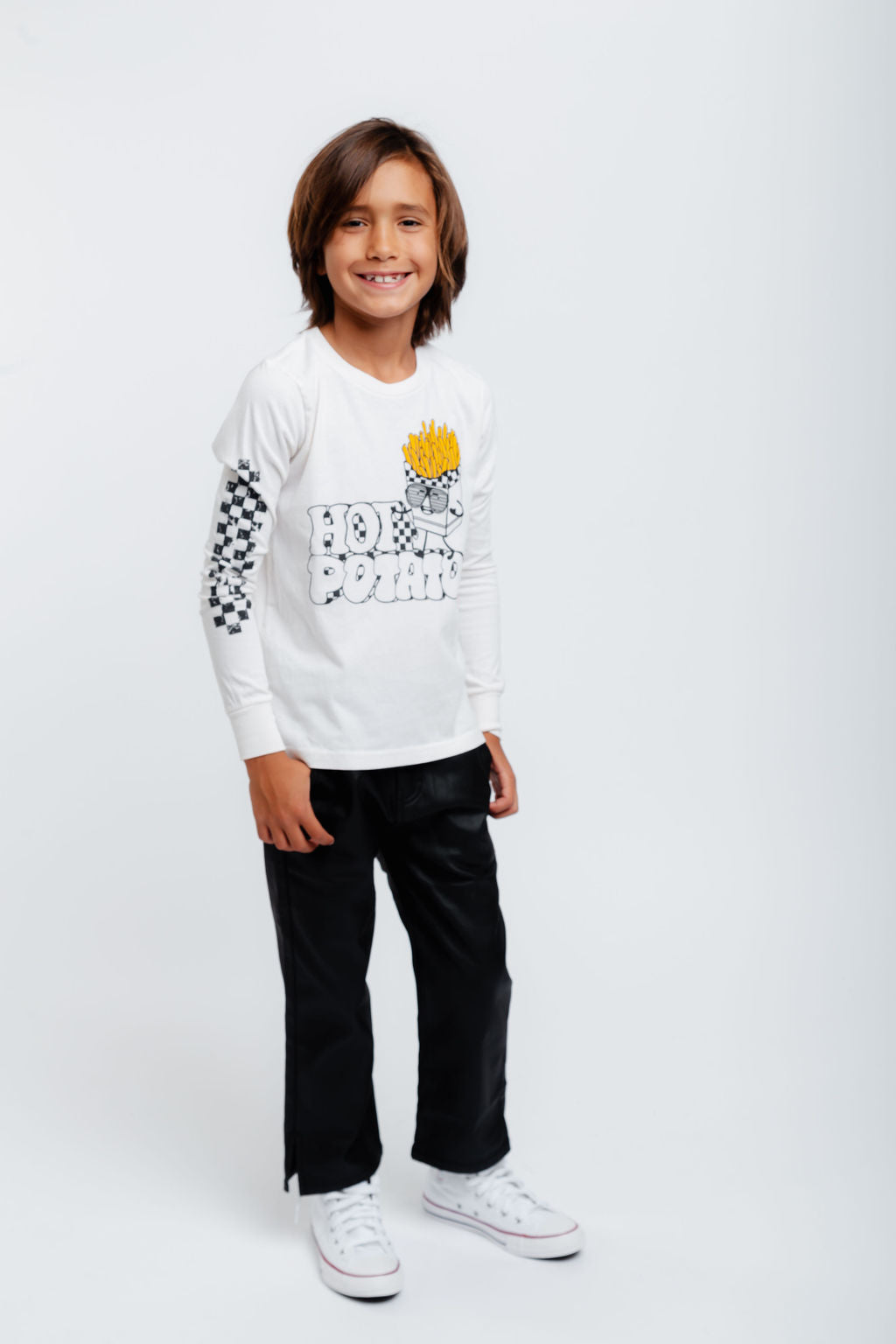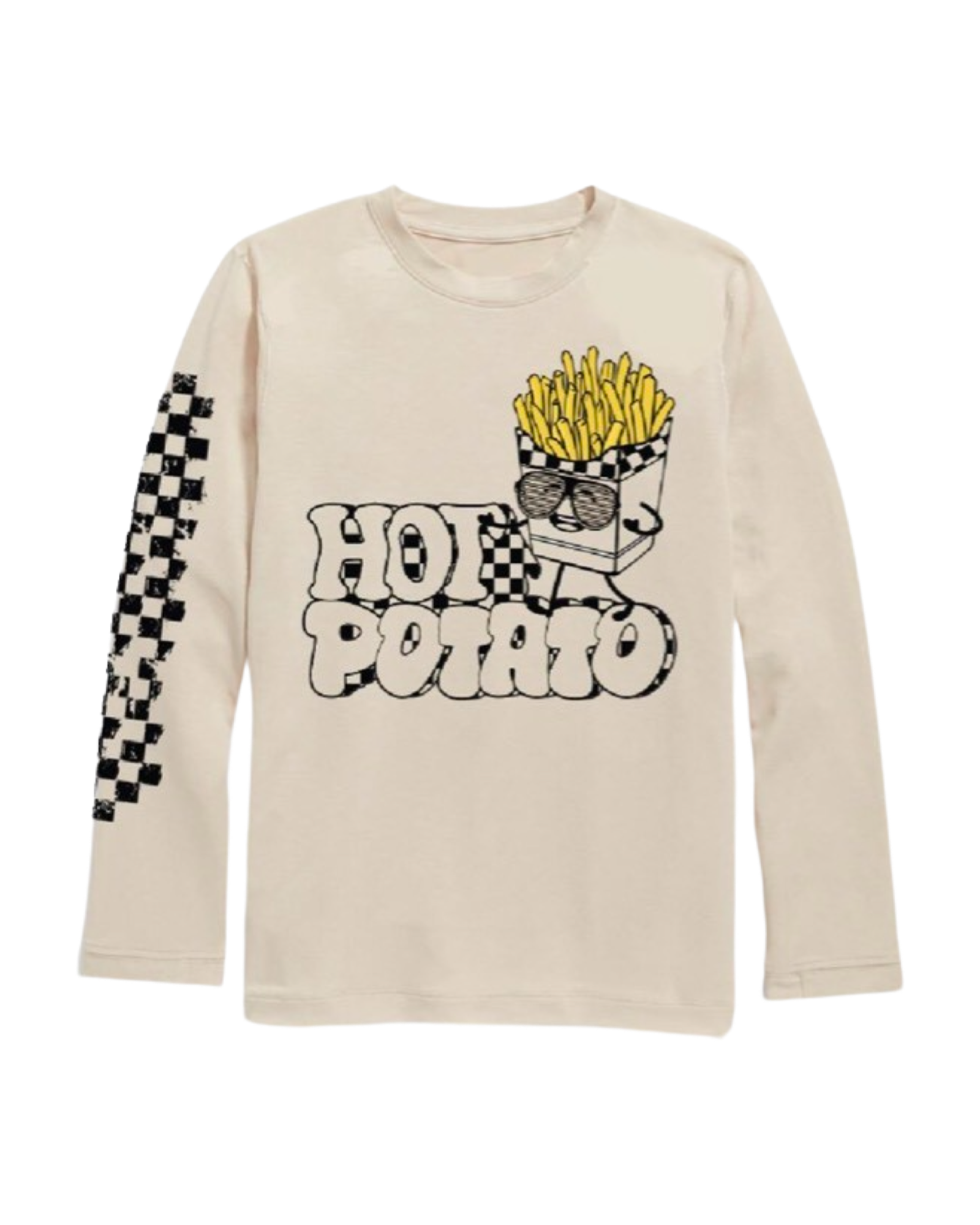 Cream-hued Hot Potato graphic on a pre-washed and pre-shrunk cotton long sleeve.