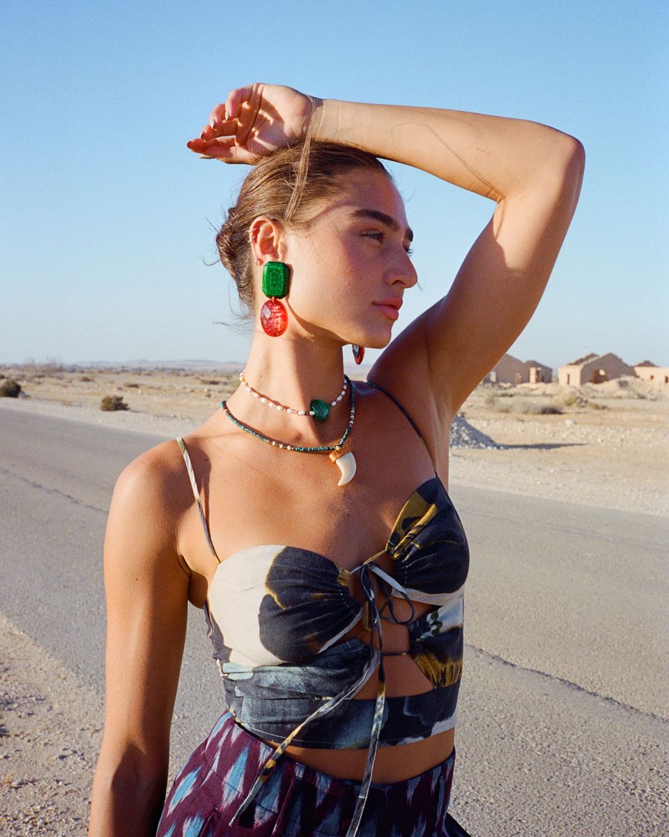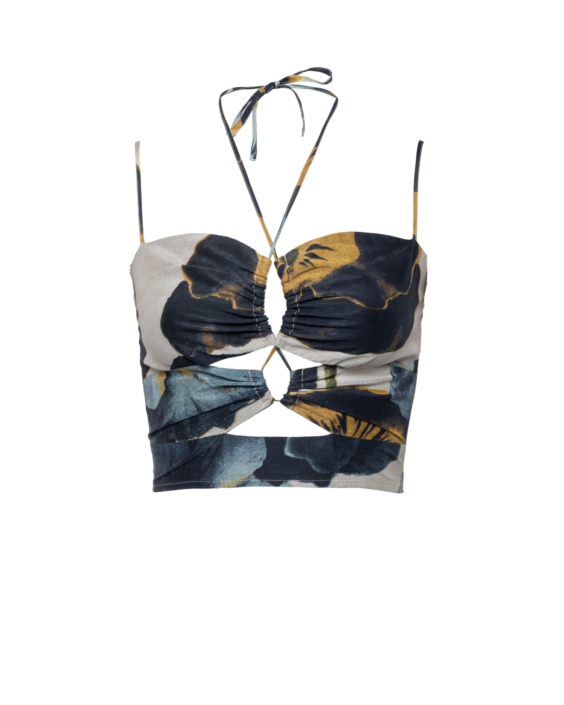 A cut out front, with a tie that can be tied in front or behind the neck. Wear with our matching Cleo ruffle skirt or any high waisted pants.