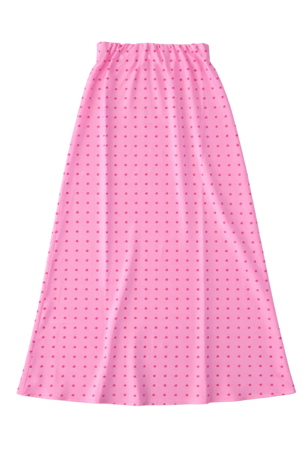 Pink Heart Satin Maxi Skirt for tweens and teen girls. Featuring a soft elastic waistband and romantic red heart print, perfect for parties, Valentine’s Day, and special occasions.