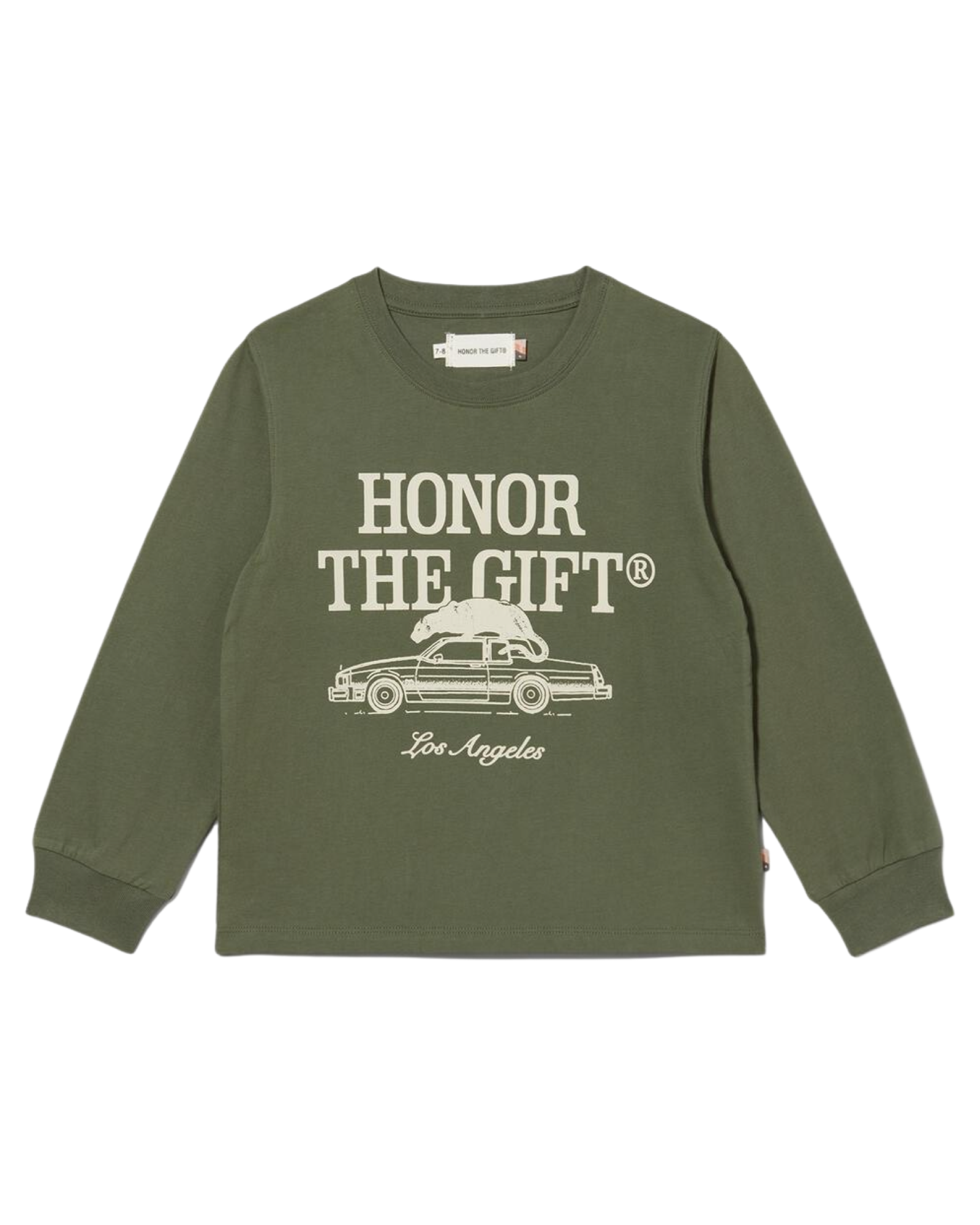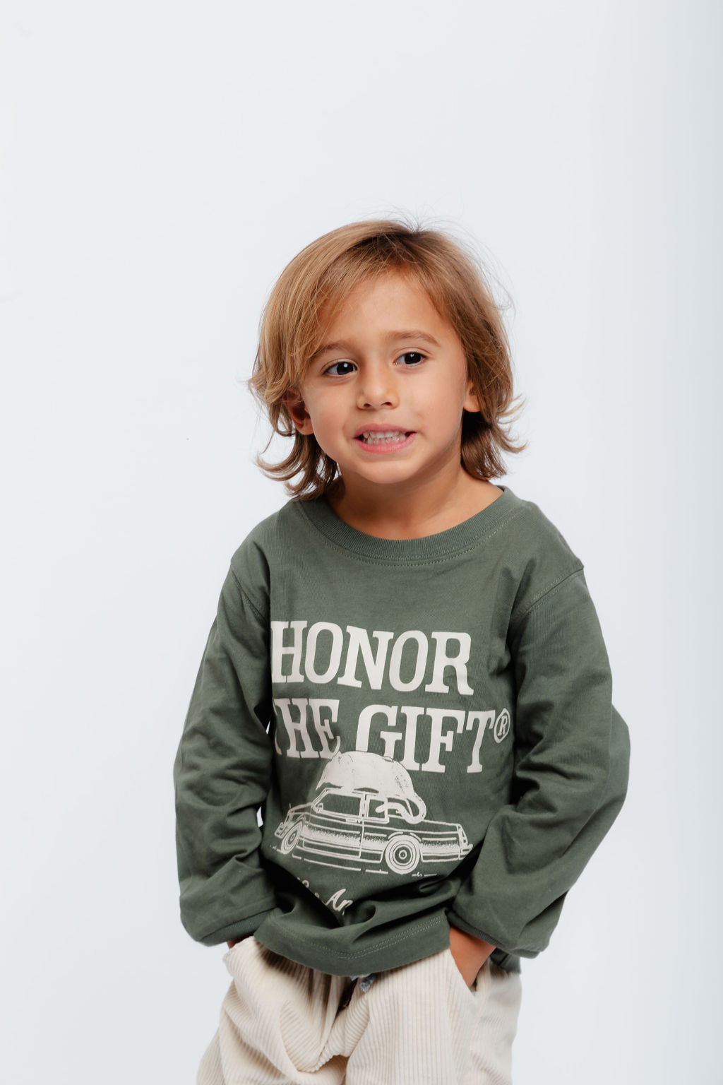 This boys tee is made from 100% soft and cool cotton in a vibrant sage green color, perfect for any occasion! With a fun and eye-catching graphic, your child will love wearing this long sleeve shirt.