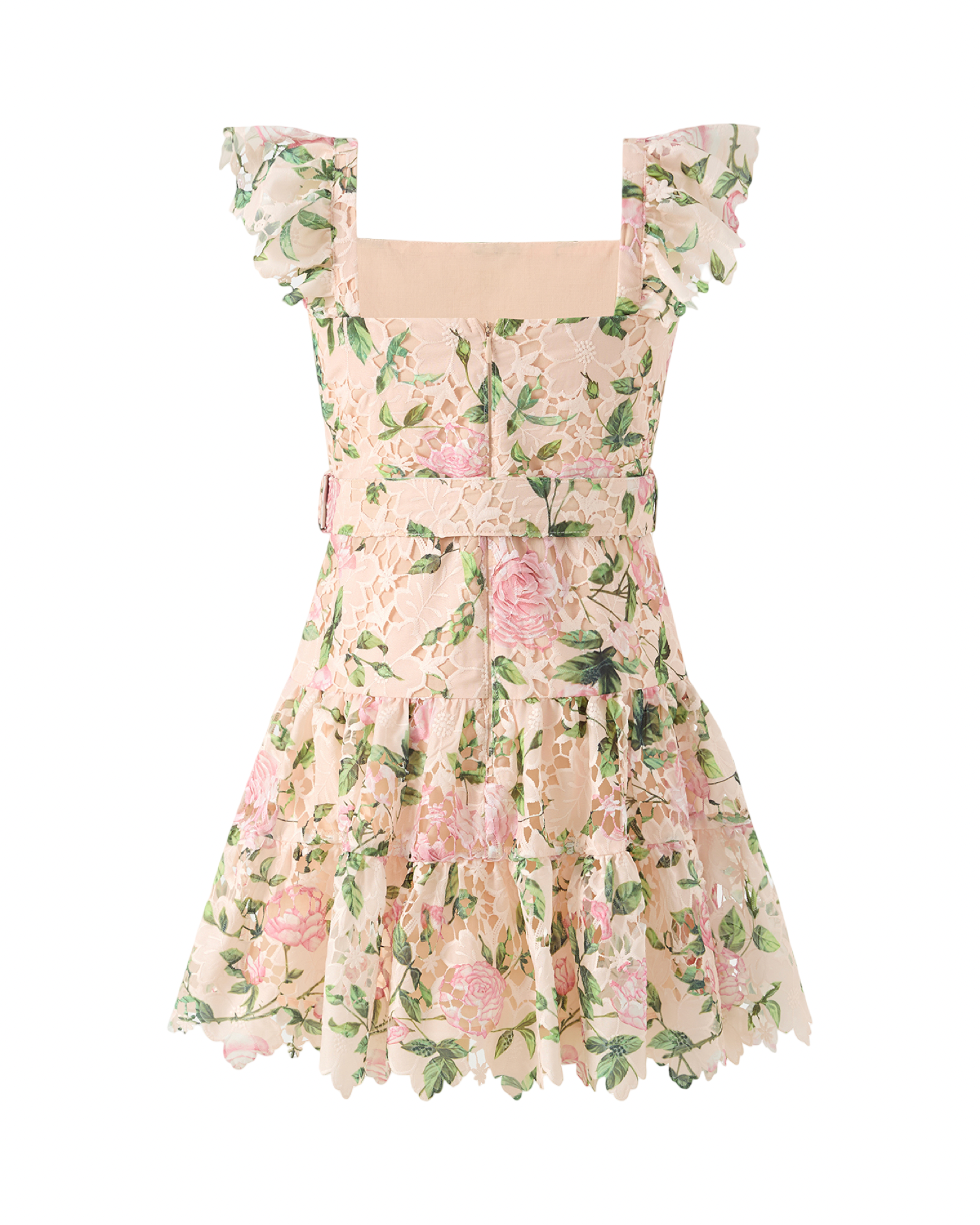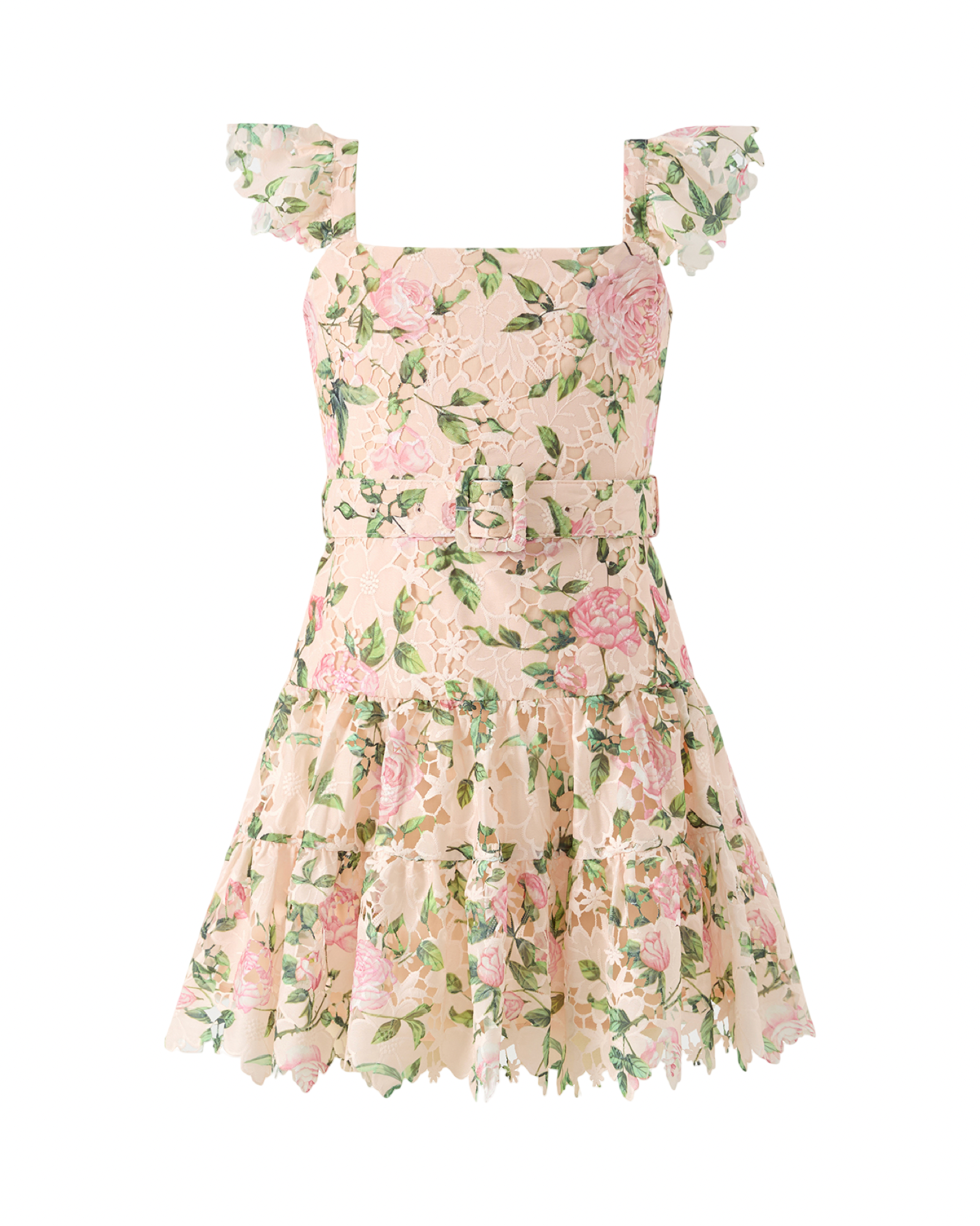 Girls floral lace dress featuring a blush pink rose print with flutter sleeves and a square neckline. Designed with a matching waist belt and a tiered skirt with scalloped lace hem. This elegant girls dress is perfect for weddings, special occasions, birthdays, holidays, and family photos. Lightweight, comfortable, and timeless for spring and summer wear.