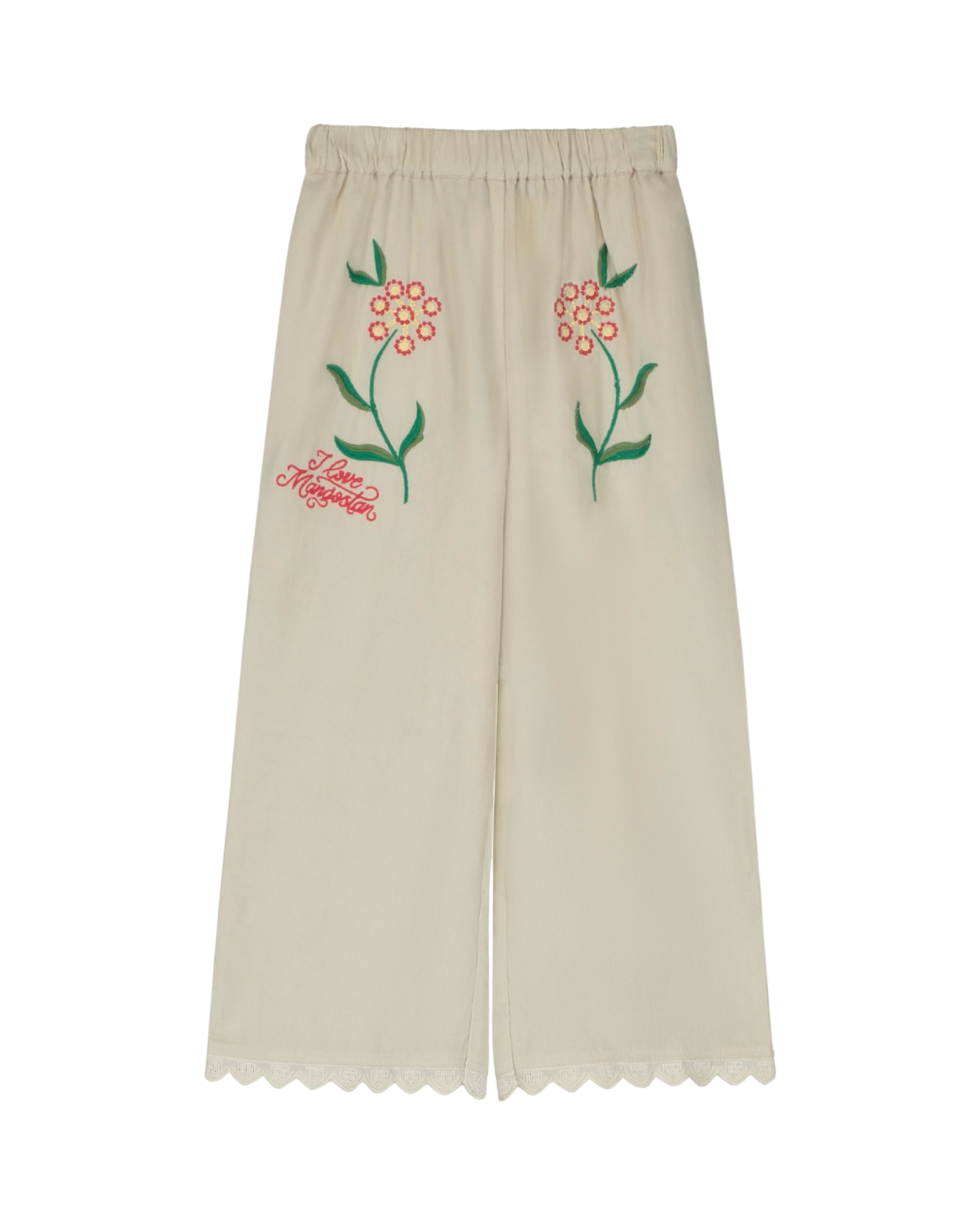 These girls' pants are made from 100% cotton angora and feature charming embroidered flowers along with cute trim accents.
