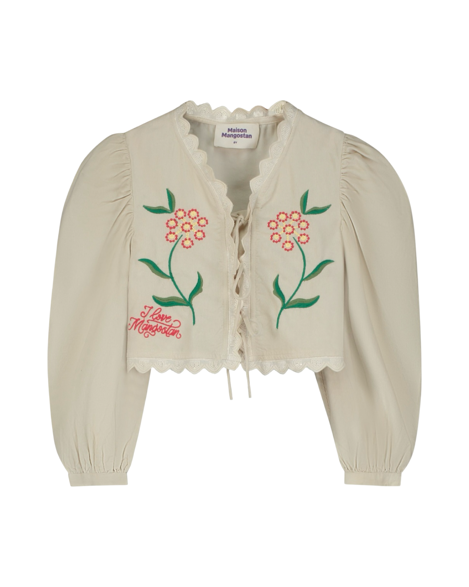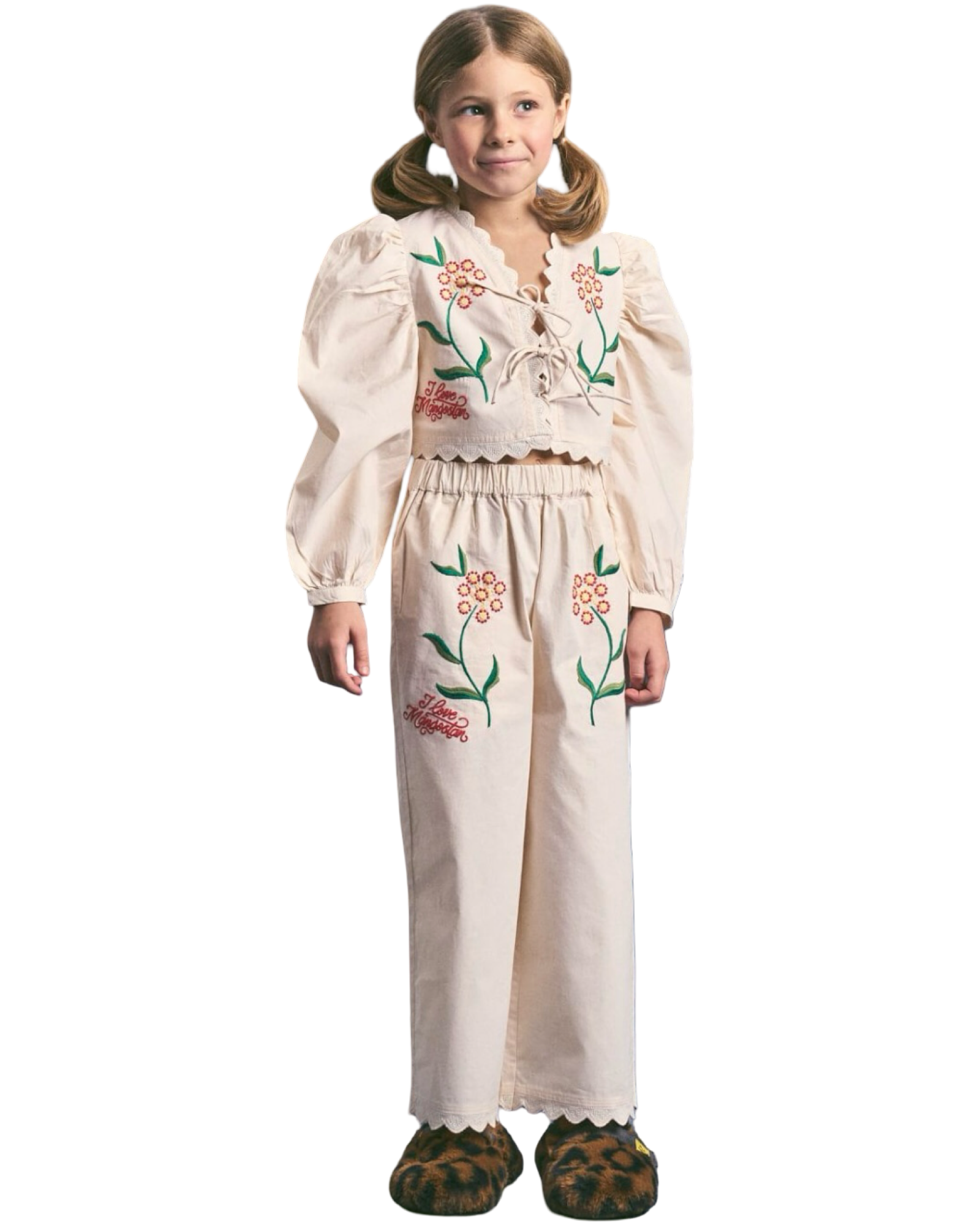 This angora girls' top is decorated with embroidered flowers and delicate trims, featuring playful puffed long sleeves and a string tie closure. Made from 100% cotton for a soft, breathable feel.