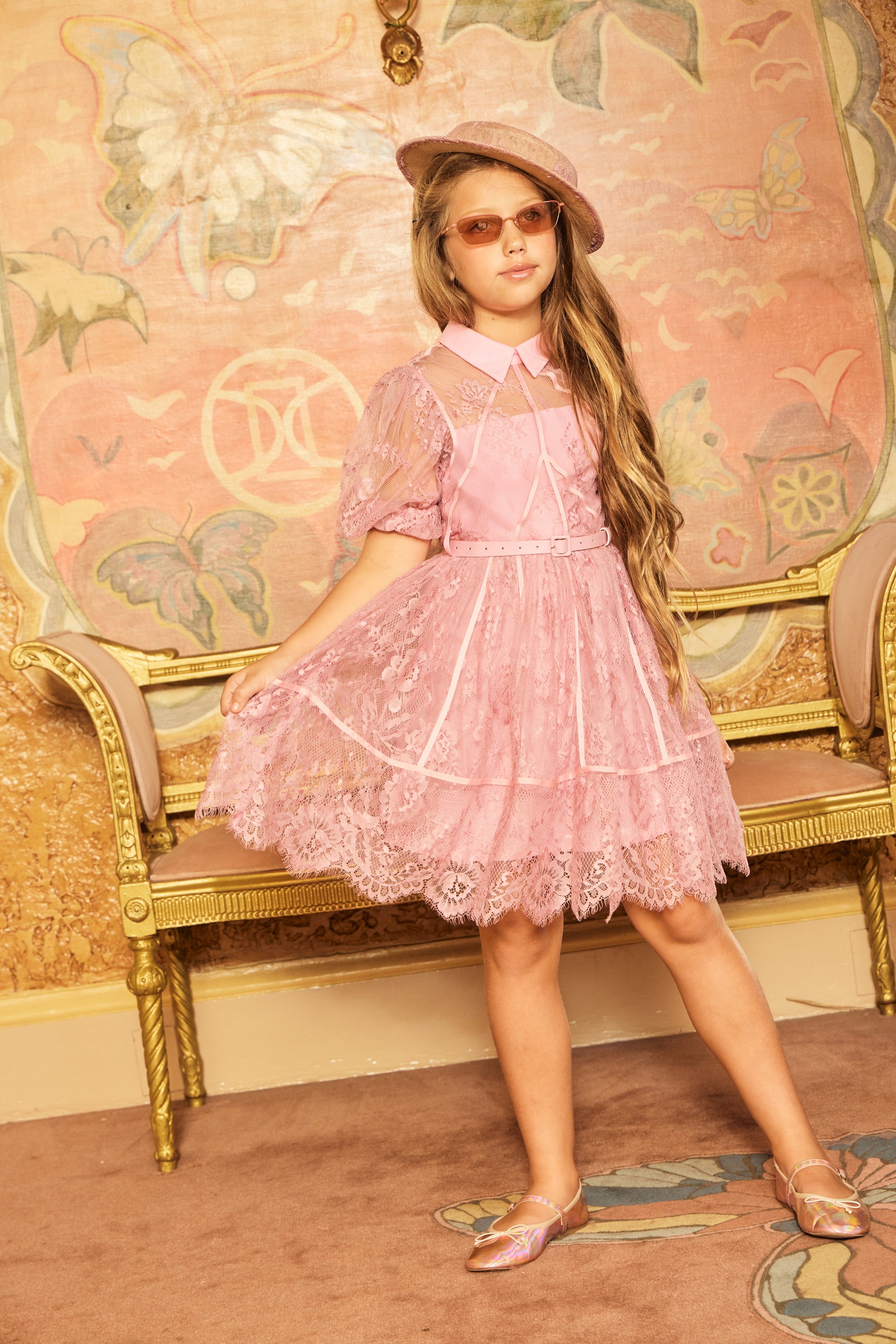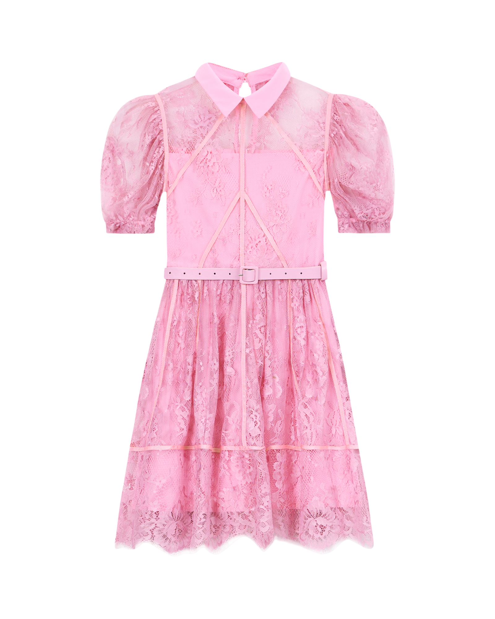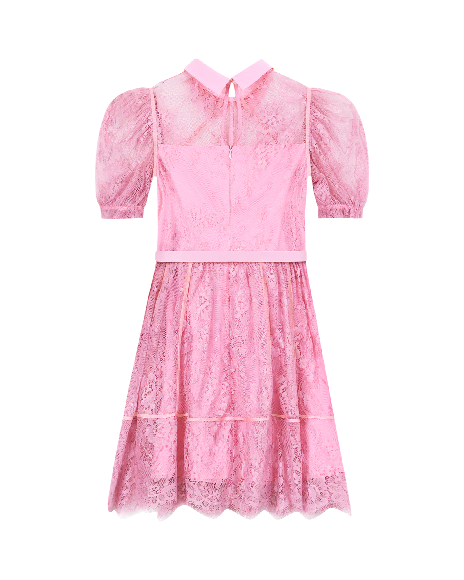 Pink lace dress for girls showcases a soft lace overlay and features a mini length and short sleeves silhouette. It is fully lined for comfort, secured with a back zipper, and crafted from 100% polyester. The dress is completed with an elegant belt.