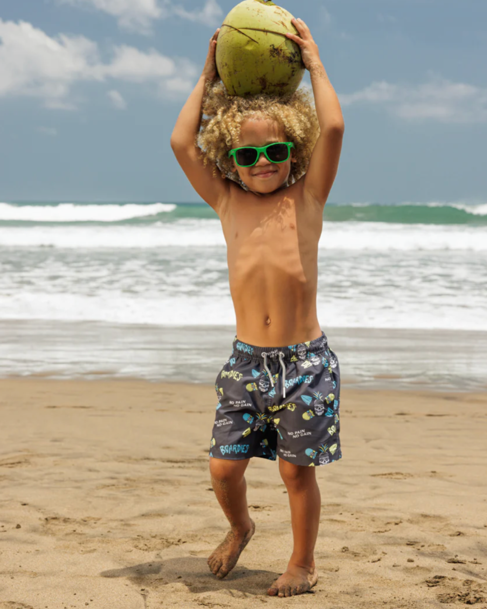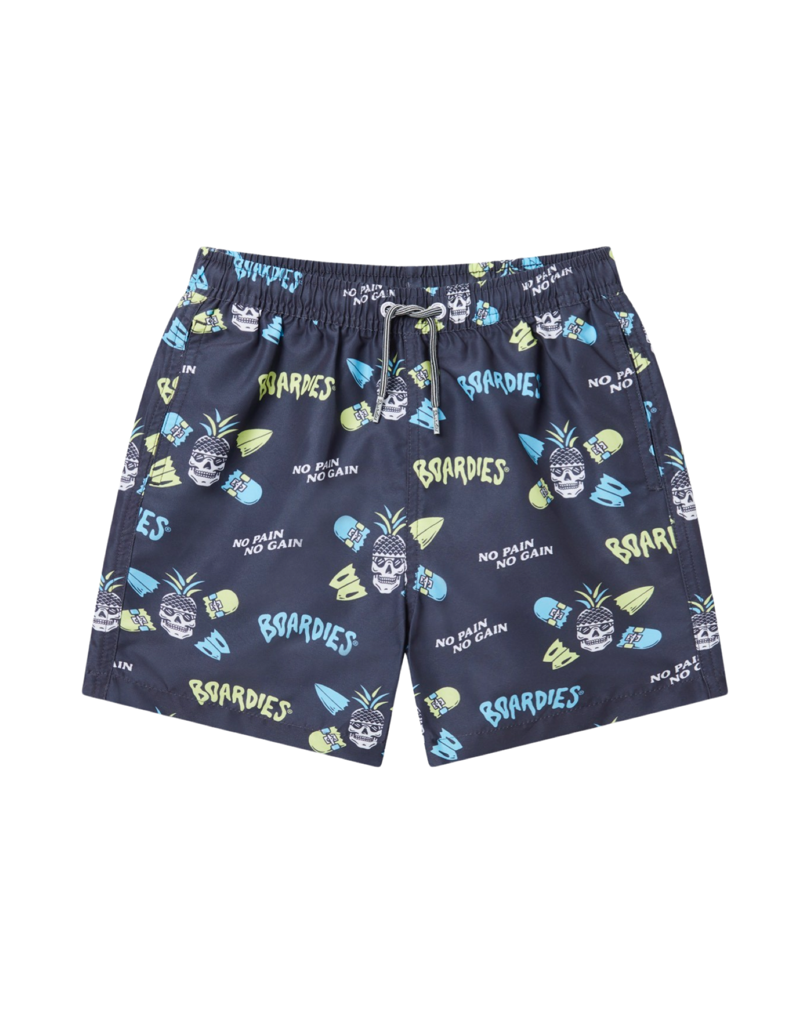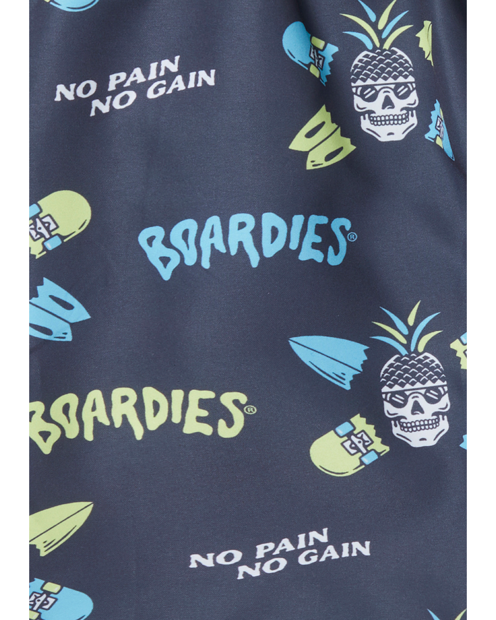 No Pain No Gain surf-skate water trunks. Crafted from super-soft, fast-drying, eco-friendly REPREVE® polyester. Every pair includes a matching swimming pouch. Soft mesh lining in trendy stonewashed grey.