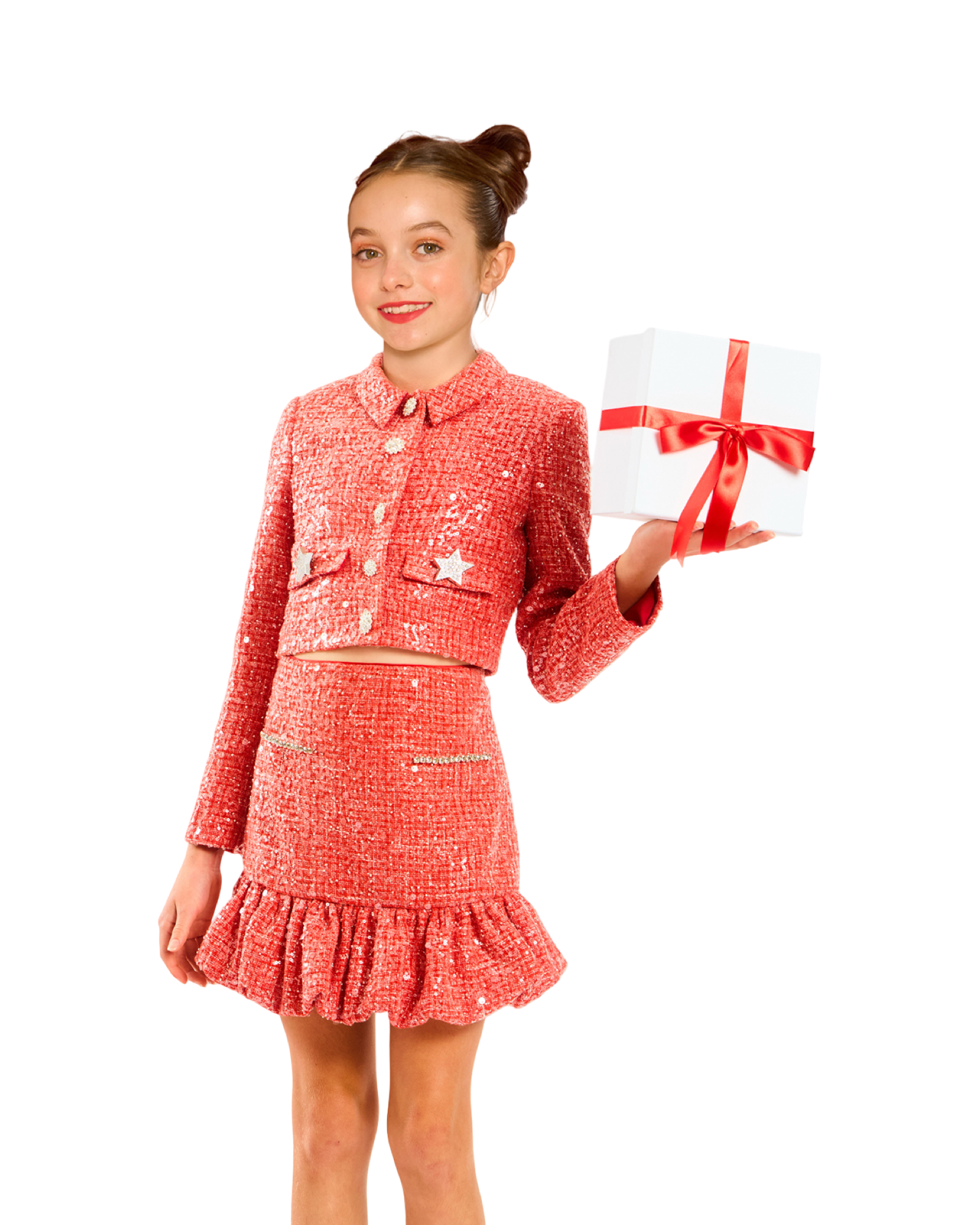 Elevate her holiday wardrobe with this dazzling tweed jacket! Featuring a timeless silhouette enhanced with eye-catching crystal buttons that catch the light, this piece brings just the right amount of sparkle to festive celebrations. Crafted from a luxurious blend of polyester and wool with a soft cotton lining, it's both comfortable and sophisticated. Style it with the matching Odelia tweed skirt to create an unforgettable coordinated ensemble that'll have her feeling like a star.