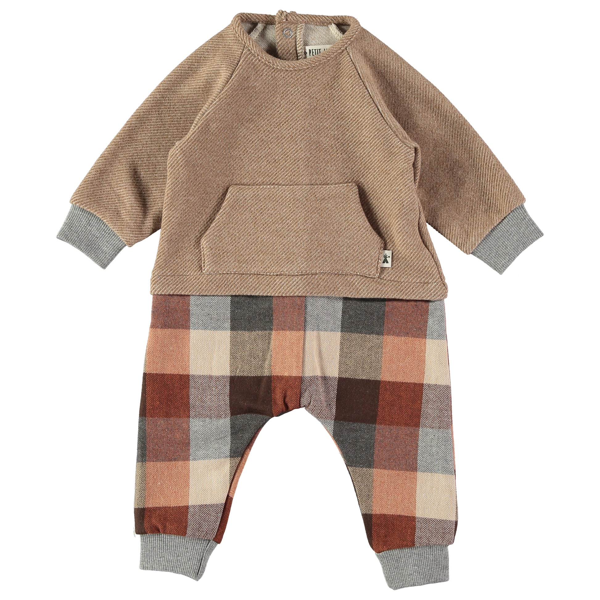 Romper is connected together as one easy piece. It has buttons on the back. Super comfy material.