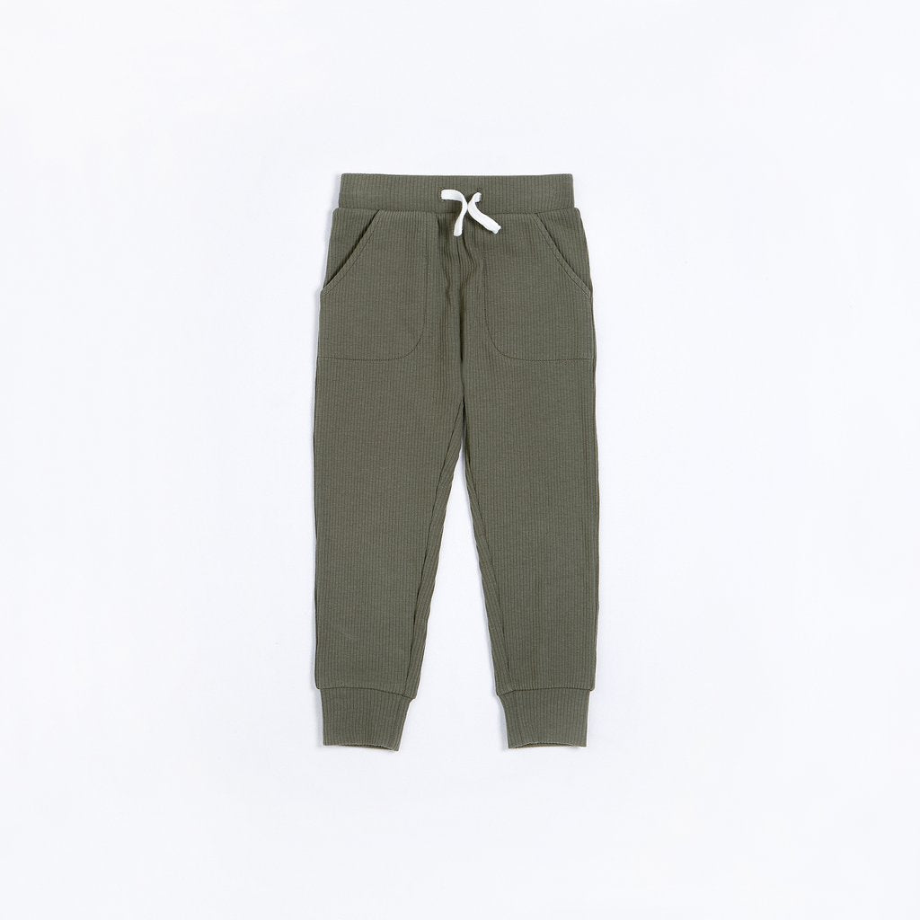Made with the finest organic cotton, these rib joggers in olive green exude sophistication and luxury. The elastic waistband, complete with a drawstring, ensures the perfect fit. Complete the look with the matching top, available now. Crafted with 55% organically grown cotton, 40% modal and 5% elastane rib, these joggers are both stylish and environmentally conscious.