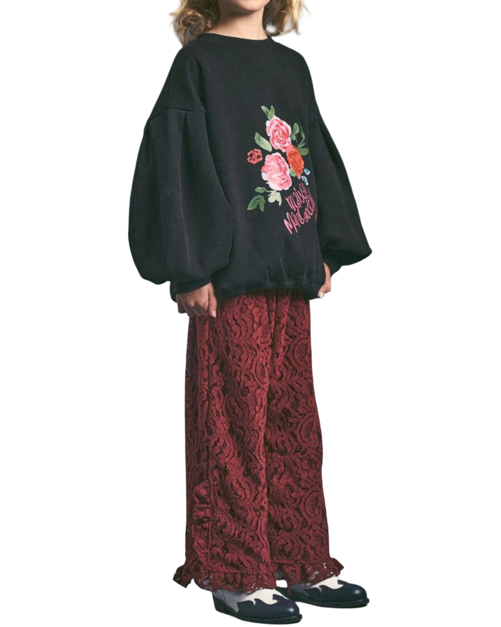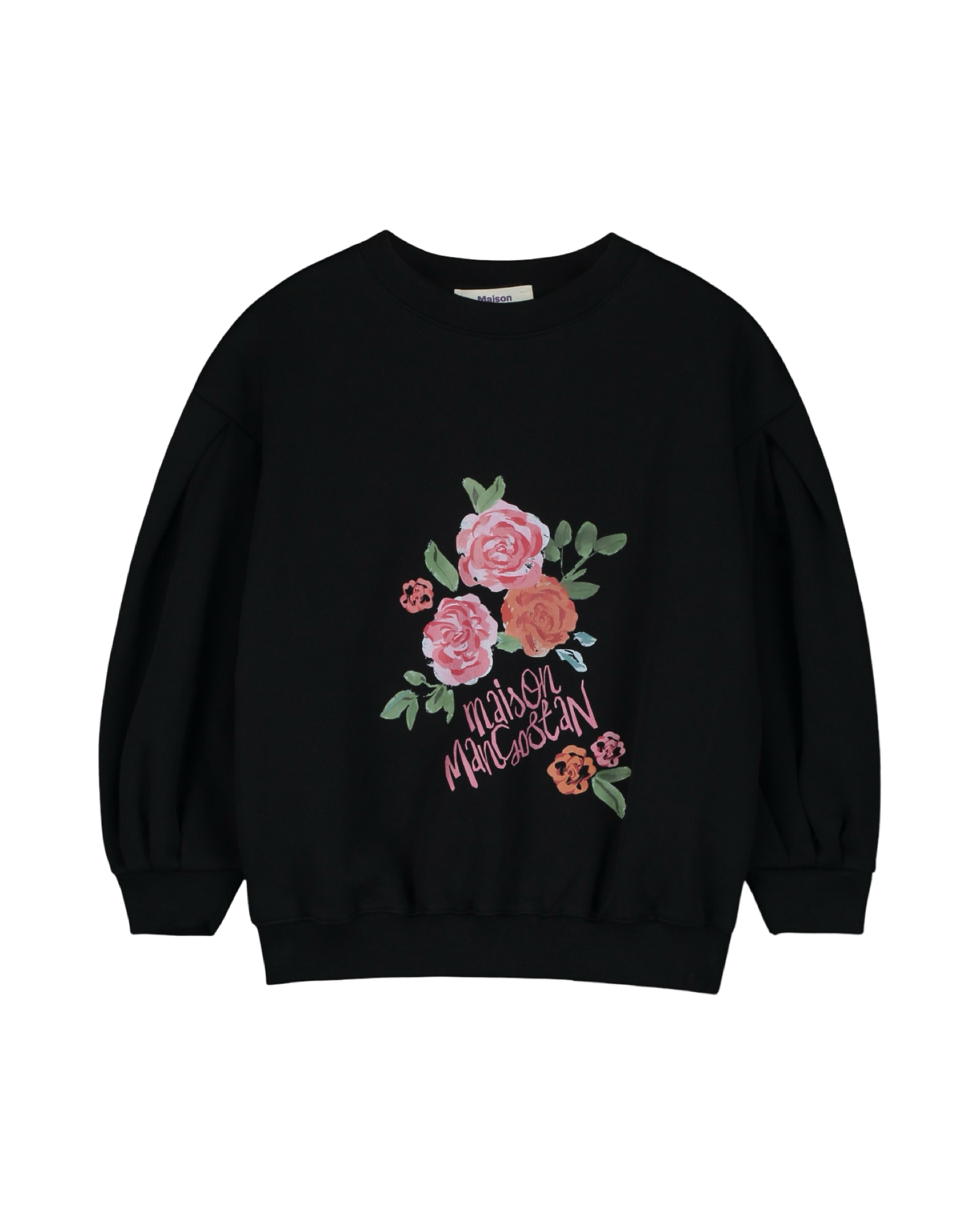 Made from 100% organic cotton, this black sweatshirt boasts fun balloon sleeves and charming floral designs for a cheerful, stylish vibe.