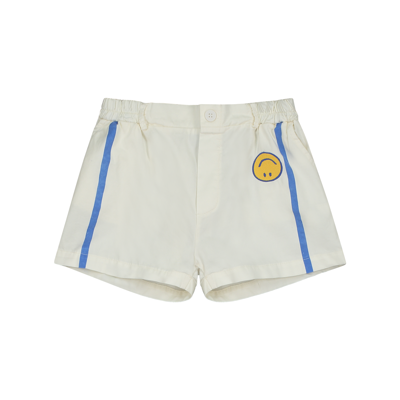 Ivory shorts with side stripes, featuring a smiley accent and elastic band for ultimate comfort and style.