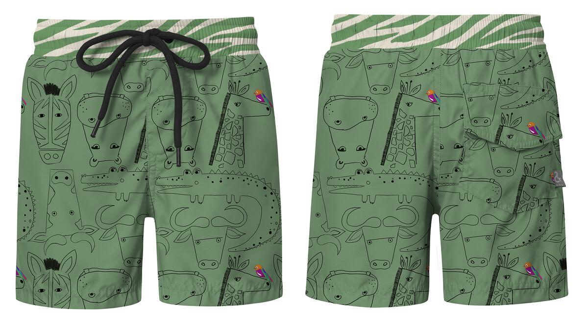 Boys Swim shorts with drawstring cord, elastic waistband, mesh liner and a back pocket.