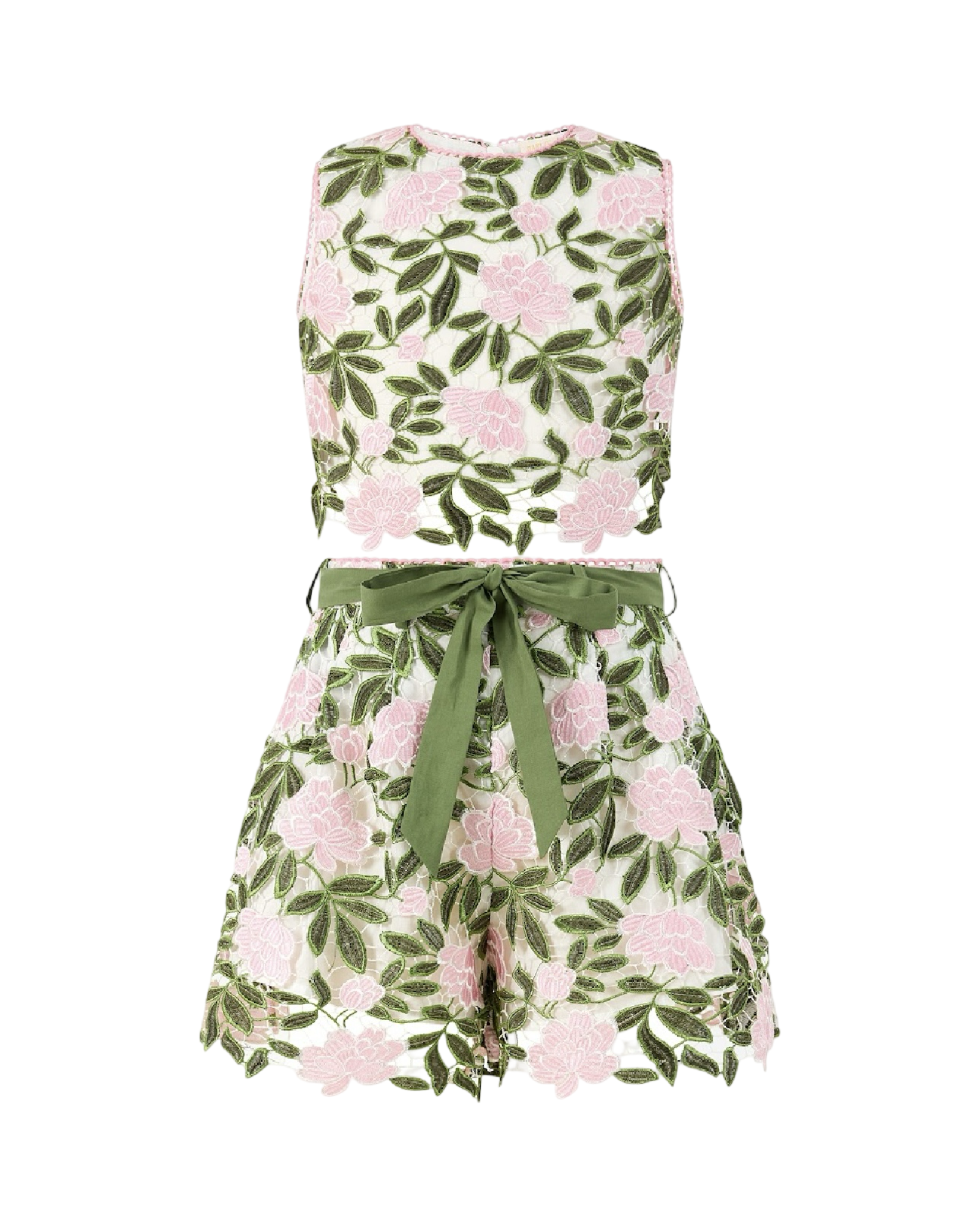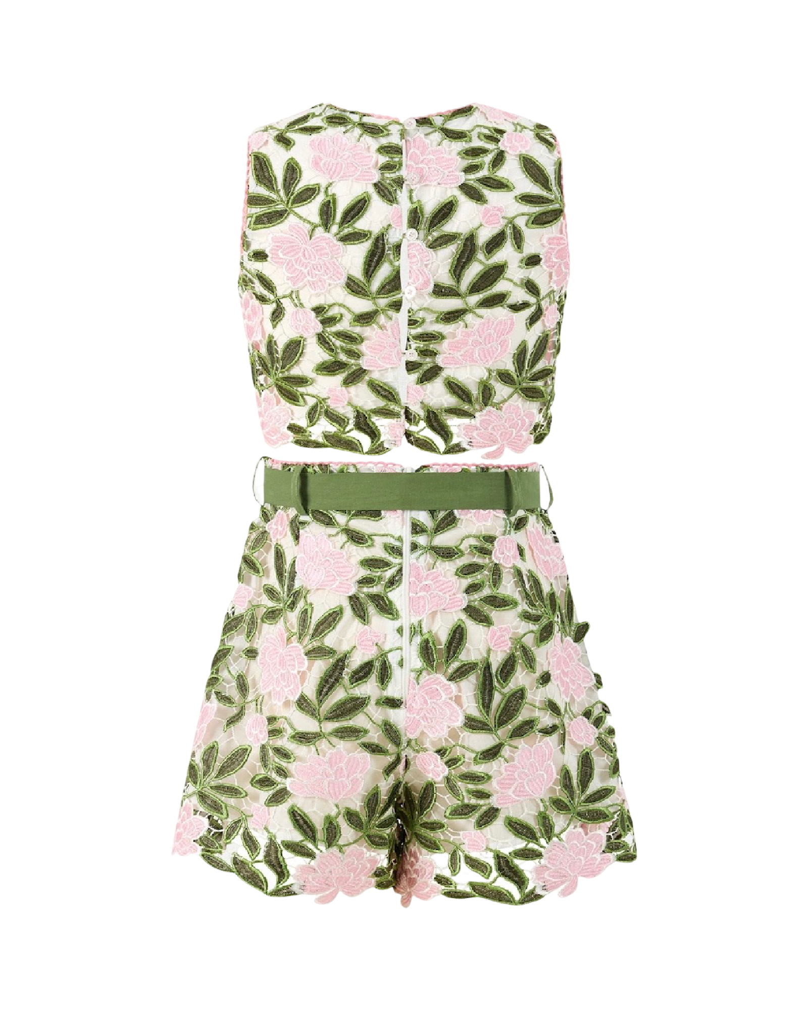 This Viola Set is perfect for a lunch date at the Beverly Hills hotel! The top features button closures on the back and a beautiful lace scalloped edge, while the shorts come with a ribbon tie belt and a zipper in the back. Plus, it's fully lined with a floral lace design.