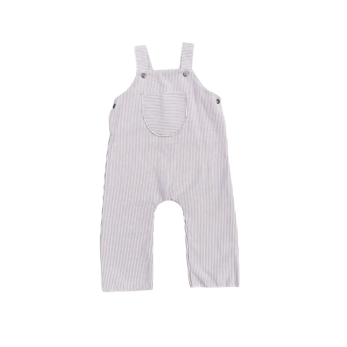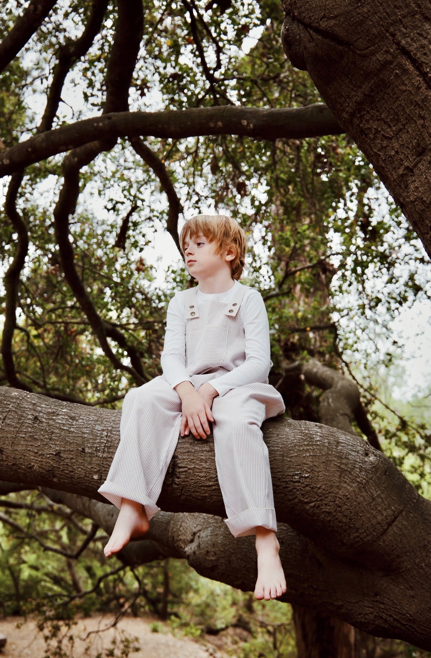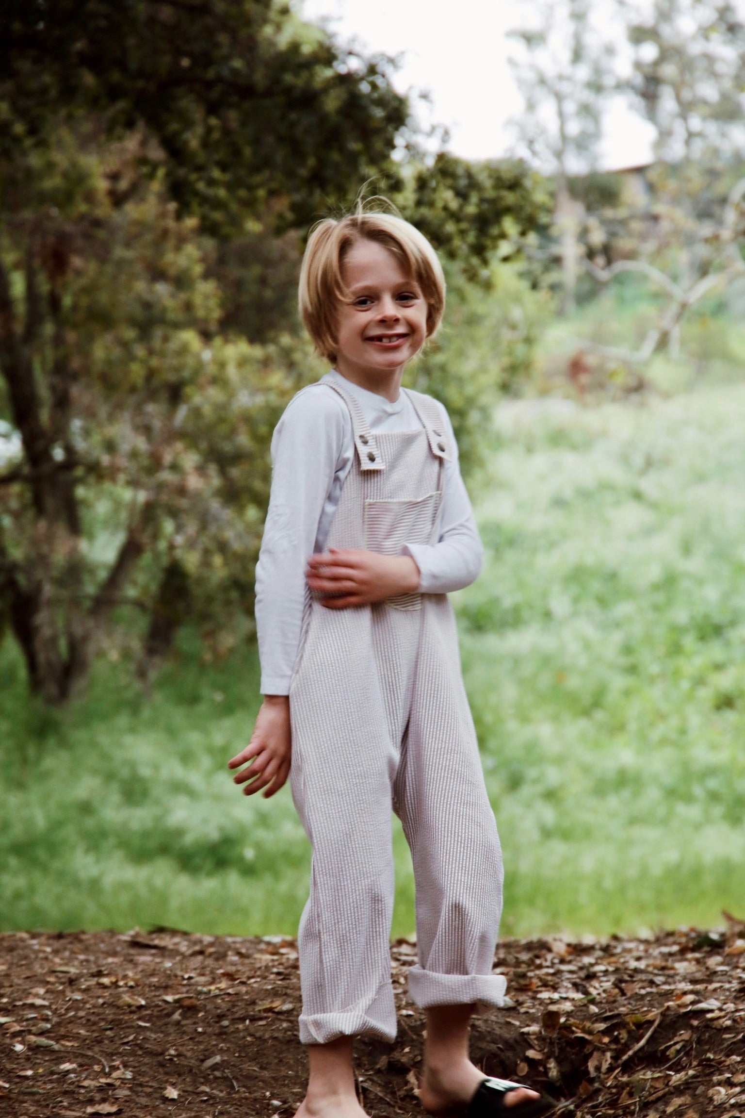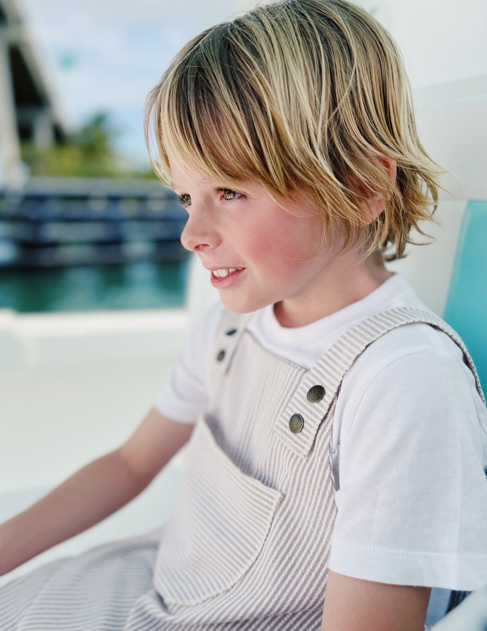 Tan and Cream Seersucker overalls with adjustable snap straps
