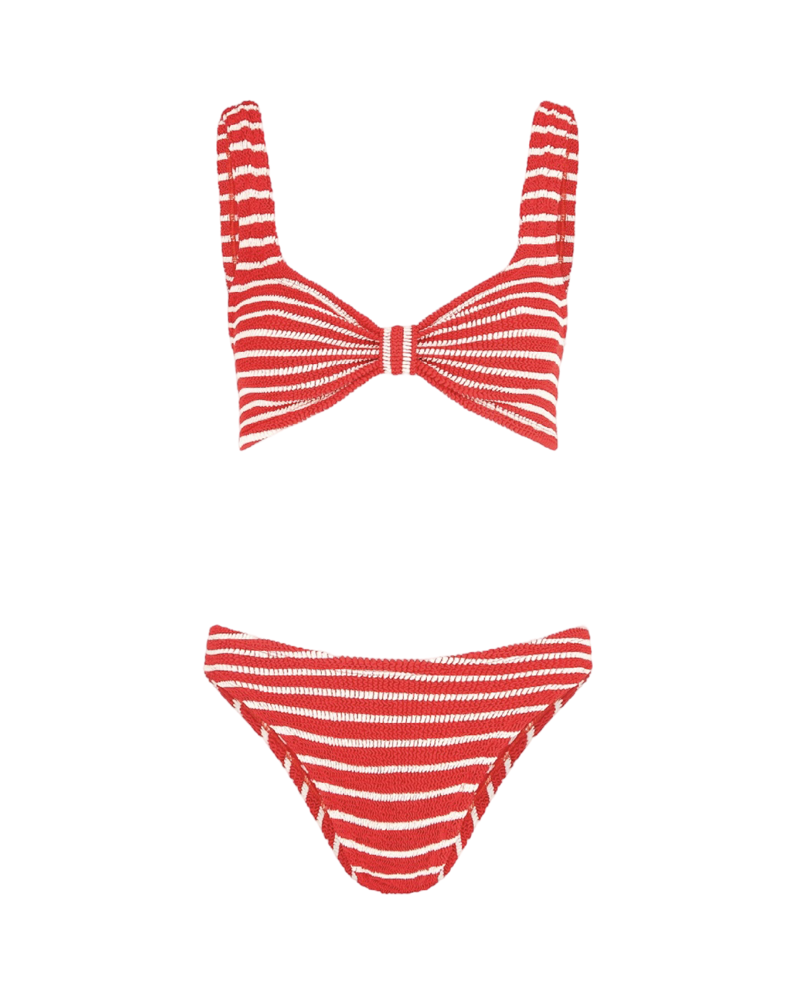 Introducing Hunza G, the must-have crinkle swimwear in a bold and chic retro red and white striped design. Featuring a charming bow-like detail on the top and medium coverage bottoms, this one-size-fits-all suit is made from incredibly comfortable and forgiving material. Experience the ultimate combination of style and comfort with Hunza G.