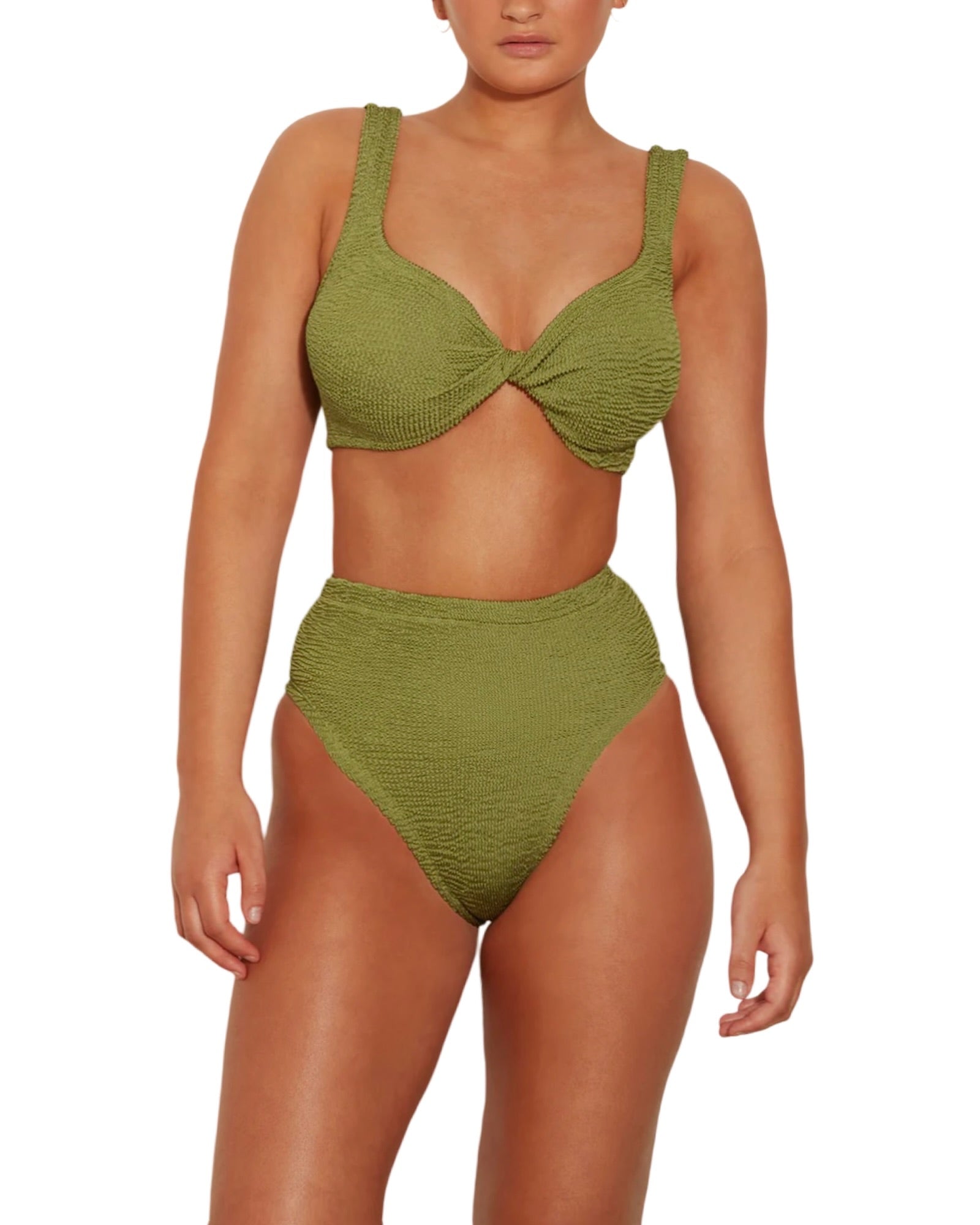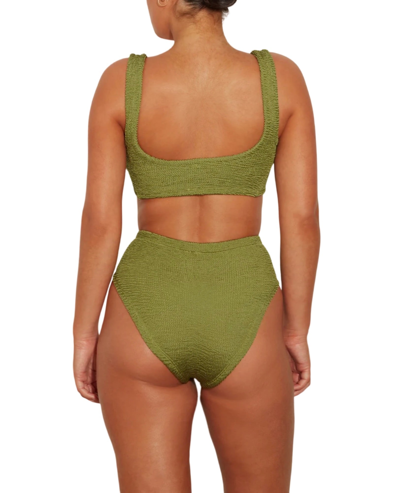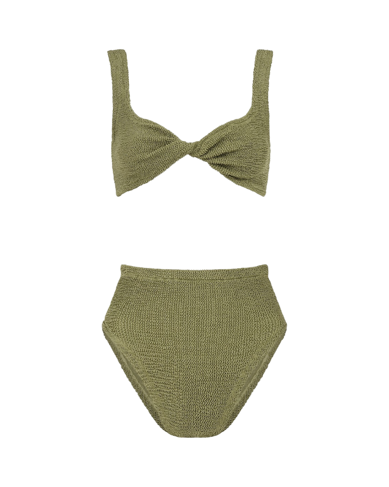 Unleash your inner goddess with Hunza G's metallic Moss crinkle swimwear. This set includes a twisted top and high waisted bottoms, ensuring a flawless fit and maximum comfort. Experience luxury and style with one size that fits all!